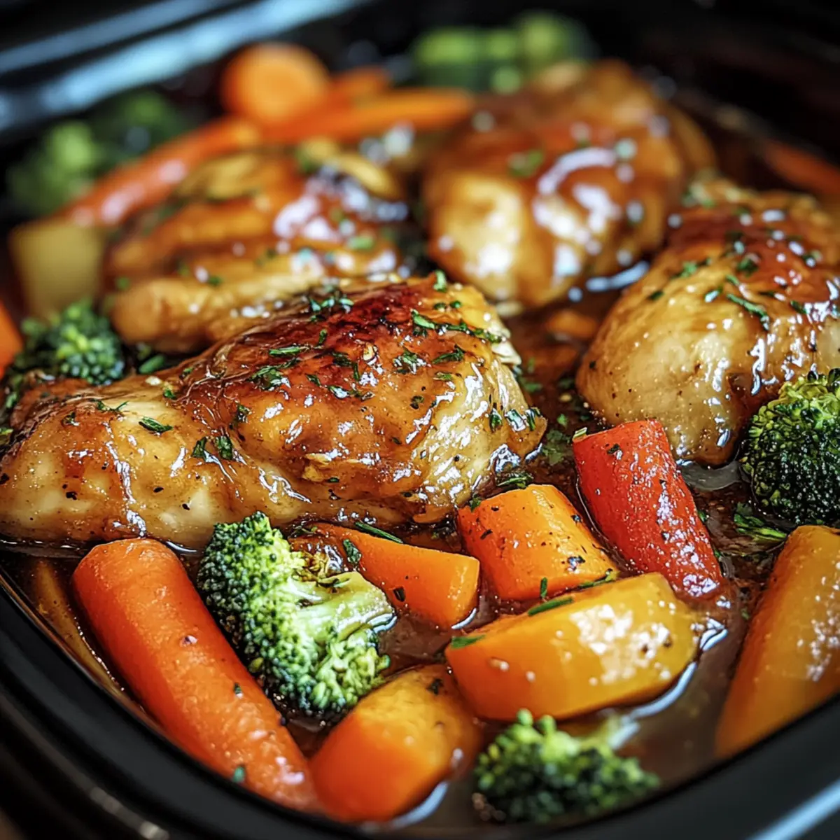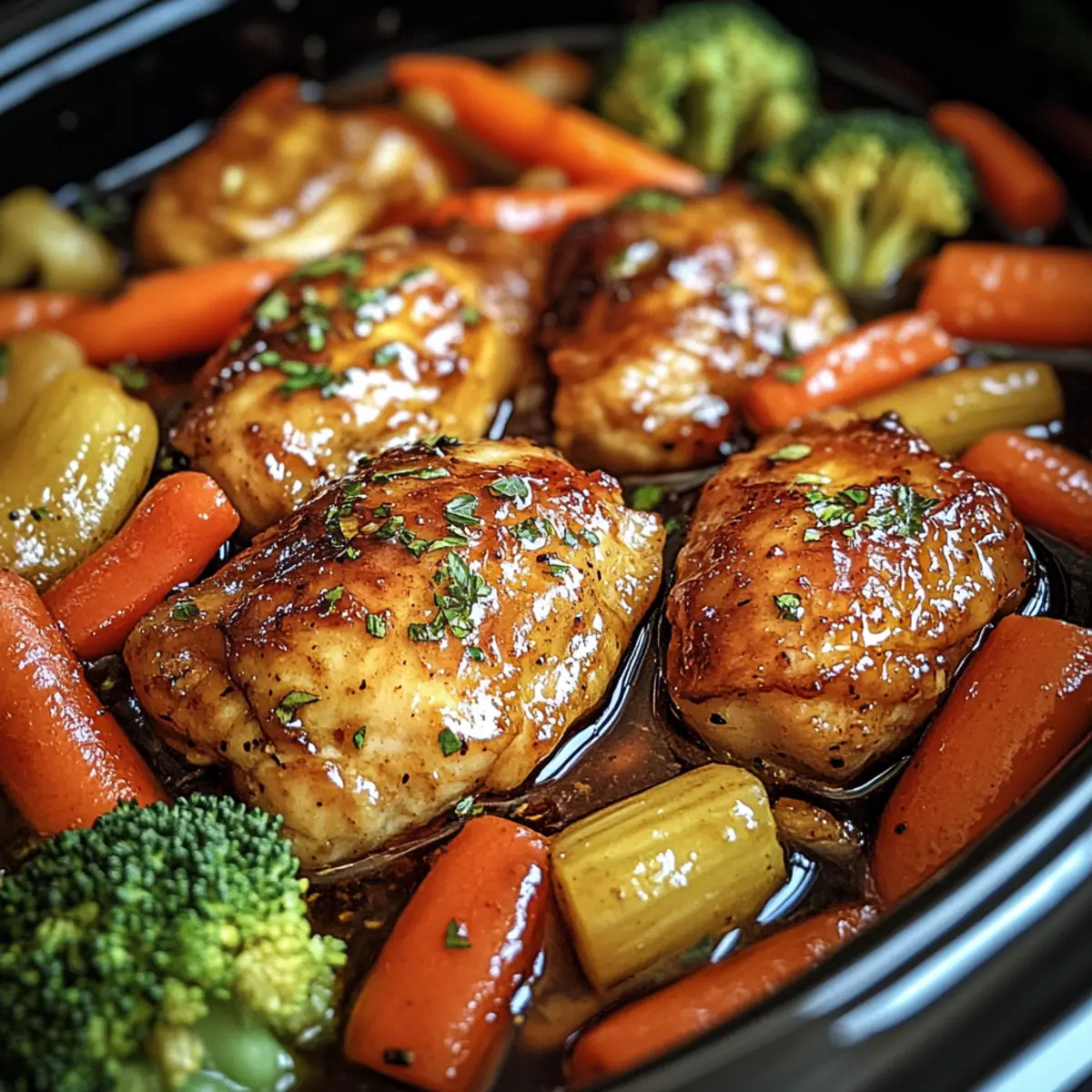 Slow Cooker Honey Garlic Chicken features tender chicken thighs and vibrant veggies in a delicious sauce, perfect for a family dinner.