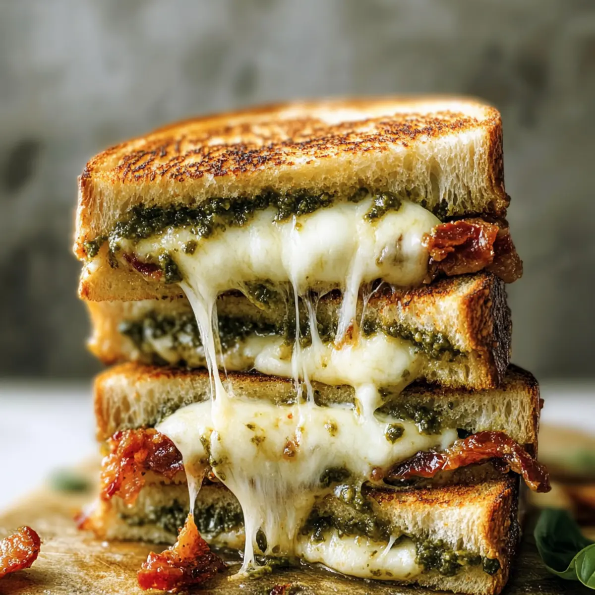Heavenly Flavor Blend: Loading this sandwich with rich mozzarella, bright basil pesto, and crispy bacon creates an irresistible taste that elevates comfort food to new heights.