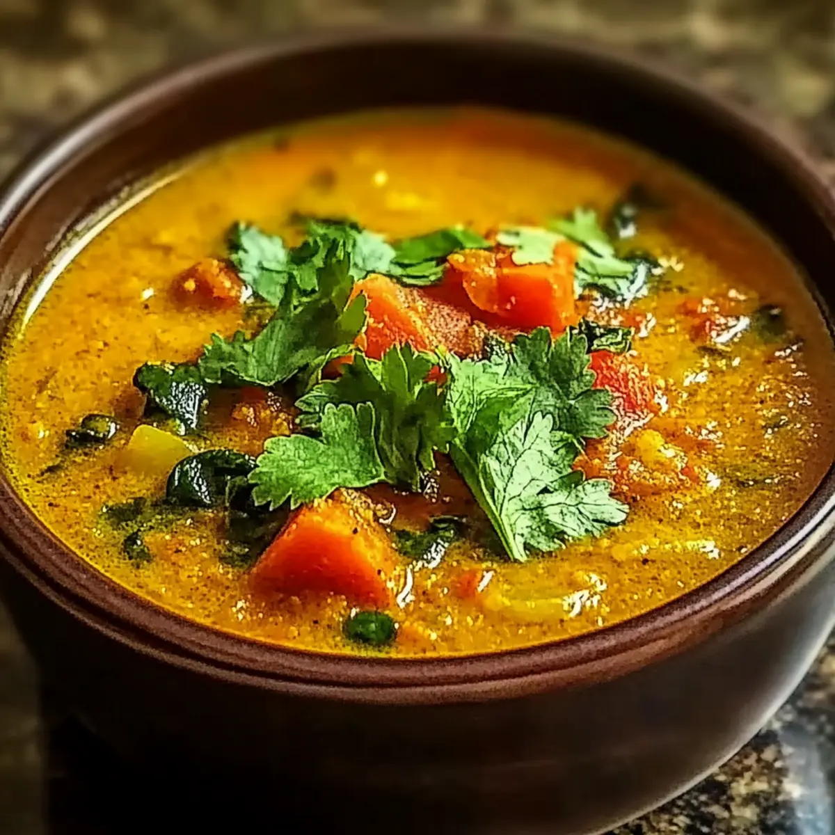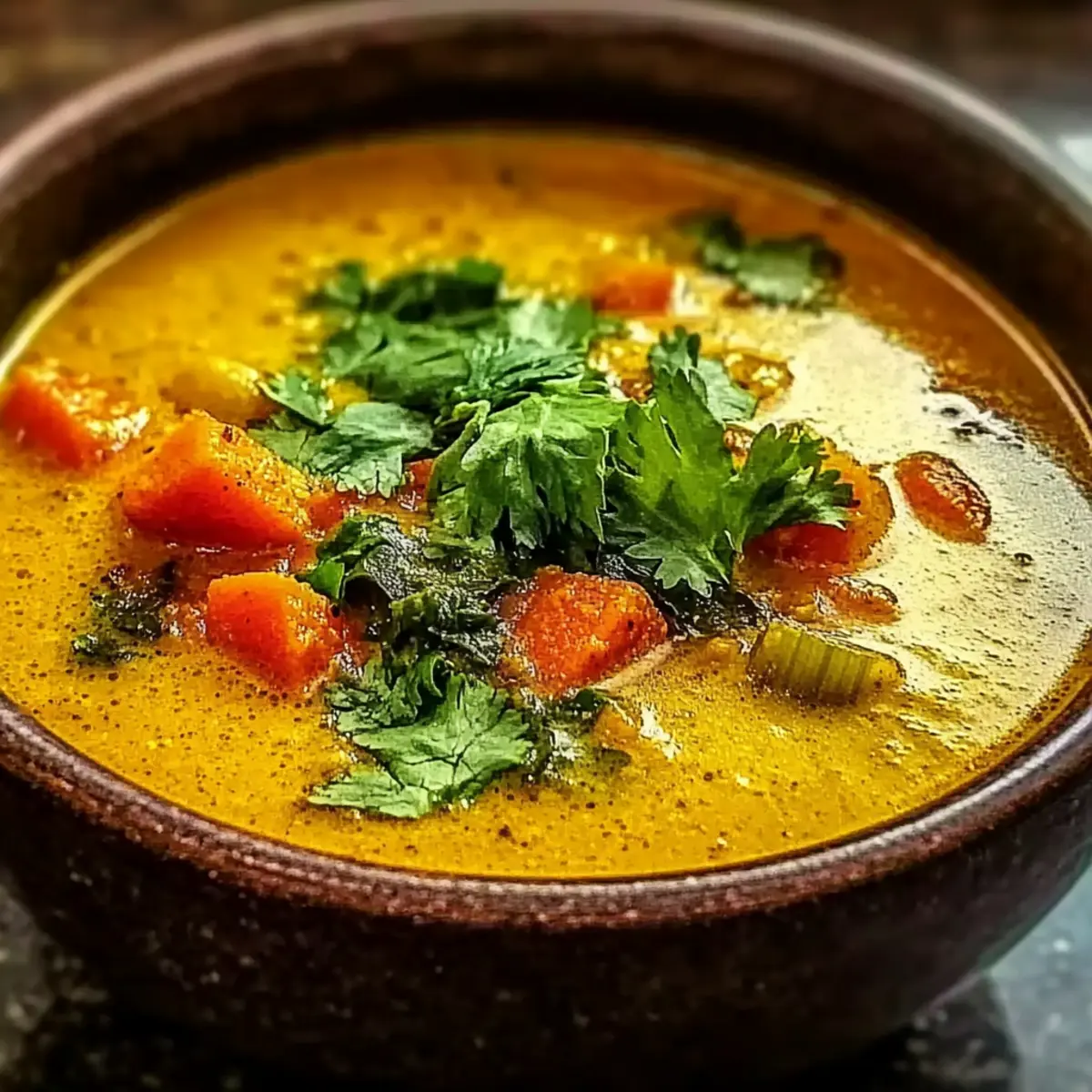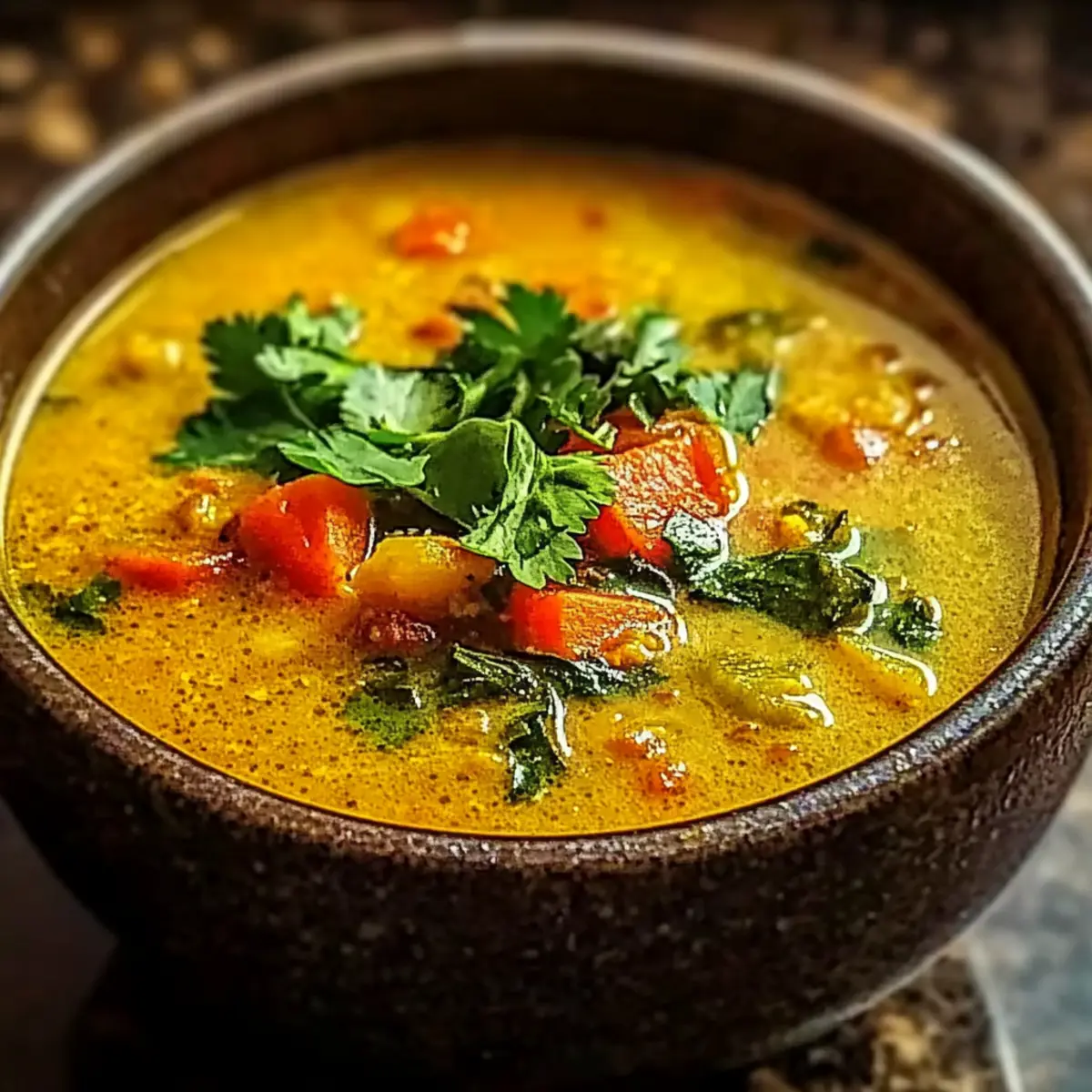 Ladle the fragrant soup into warm bowls, savoring the comforting aroma. Season with salt and pepper to taste. For garnish, sprinkle fresh cilantro or drizzle a touch of coconut milk atop each serving, and enjoy this delightful Spicy Indian Mulligatawny Soup, a true hug in a bowl!