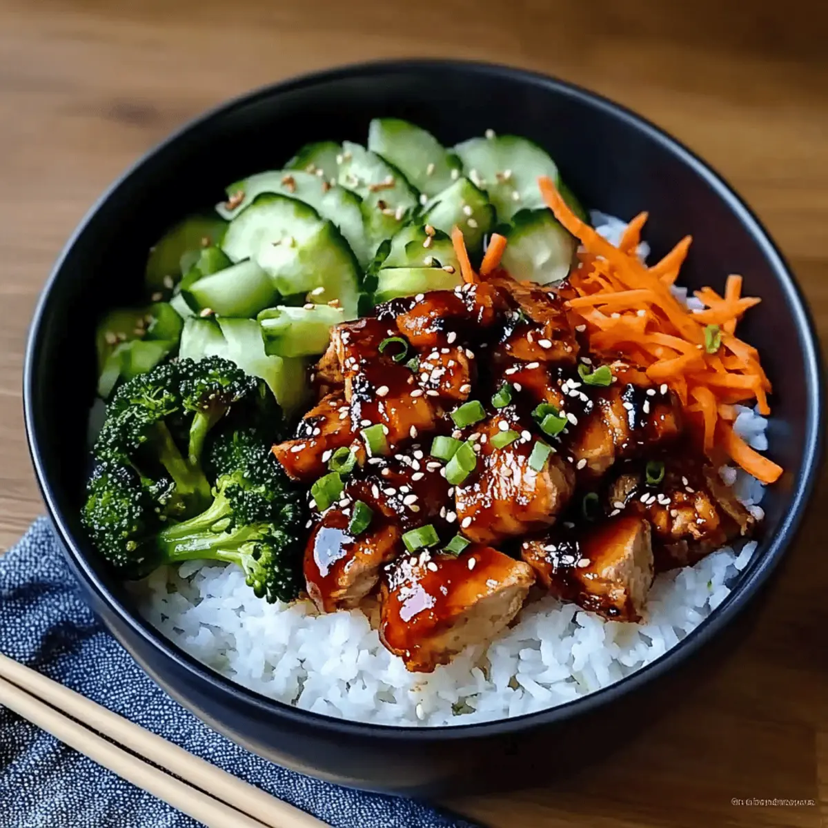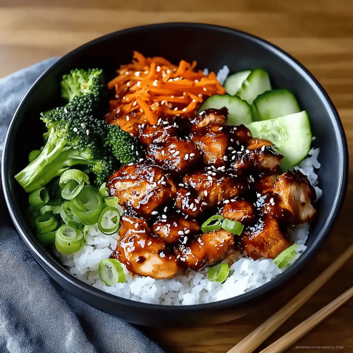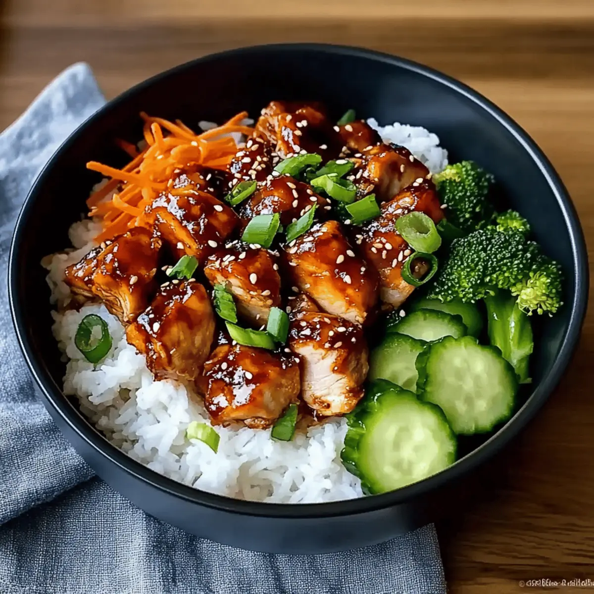 - Assemble the Bowl with rice, topped with sliced chicken, steamed broccoli, shredded carrots, and drizzled with thickened sauce.
