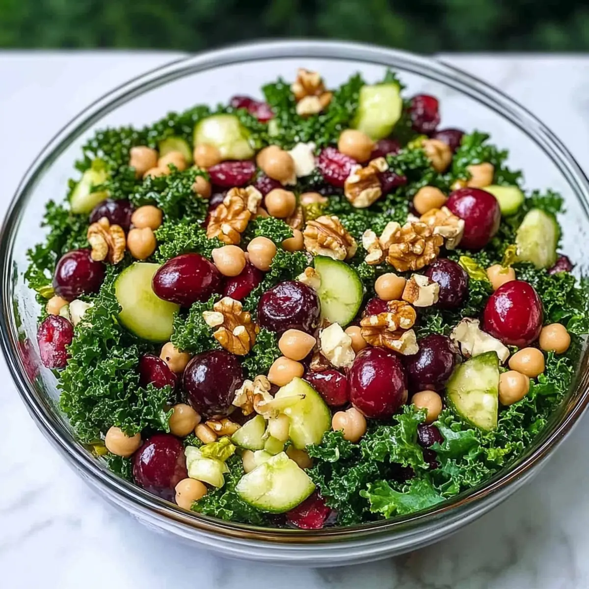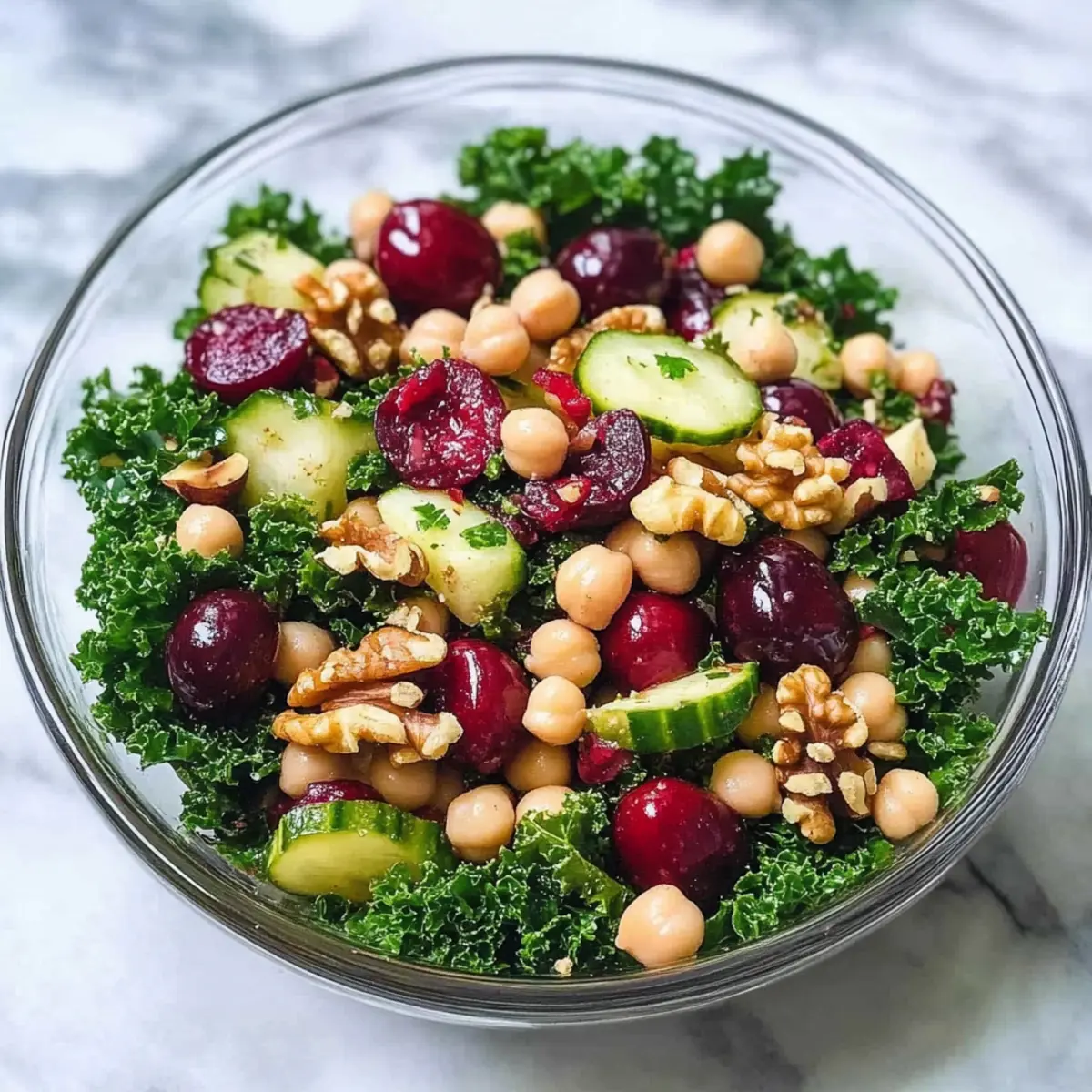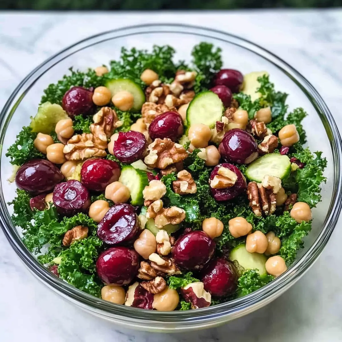 Fresh, Vibrant Ingredients: This Detox Salad is a colorful blend of kale, cherries, and walnuts, creating a feast for both the eyes and taste buds.