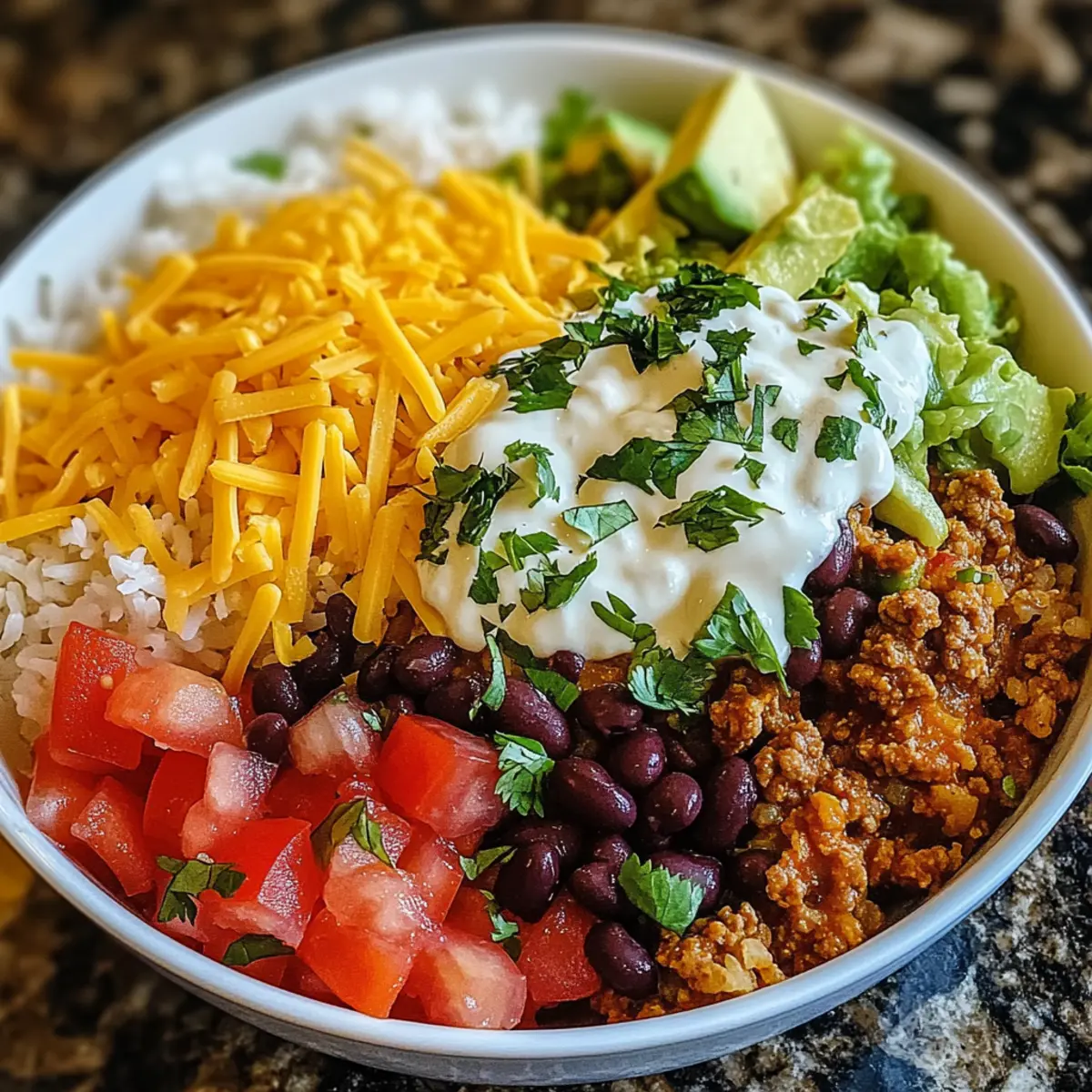 - Assemble the bowls starting with rice, add beans and meat mixture, then top with lettuce, tomatoes, cheese, and other desired toppings.