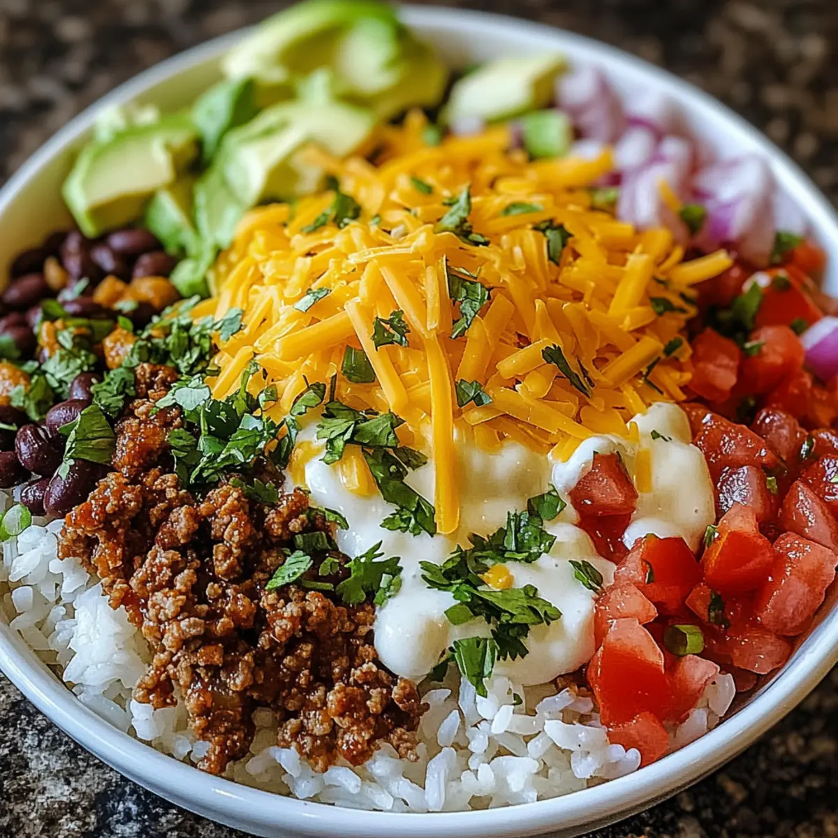 To create your Taco Rice Bowl, start with a generous layer of cooked rice at the bottom of serving bowls. Next, add the black beans and the seasoned meat mixture, creating a hearty base. Top generously with shredded lettuce, diced tomatoes, cheddar cheese, and any other toppings you’d like, such as salsa or avocado. Finish with a squeeze of lime juice for zest.