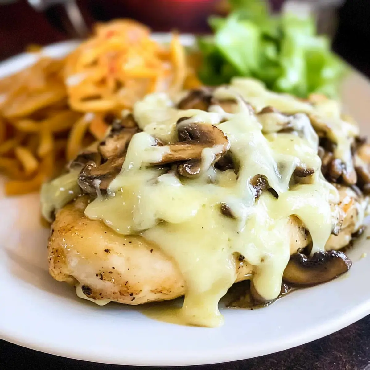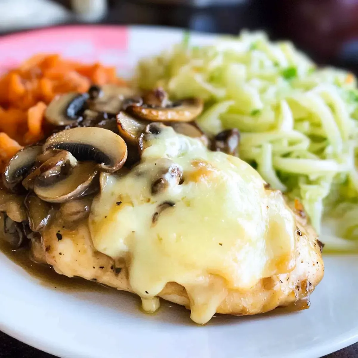 - Top each chicken breast with sautéed onions and mushrooms, then sprinkle with grated Monterey Jack cheese.