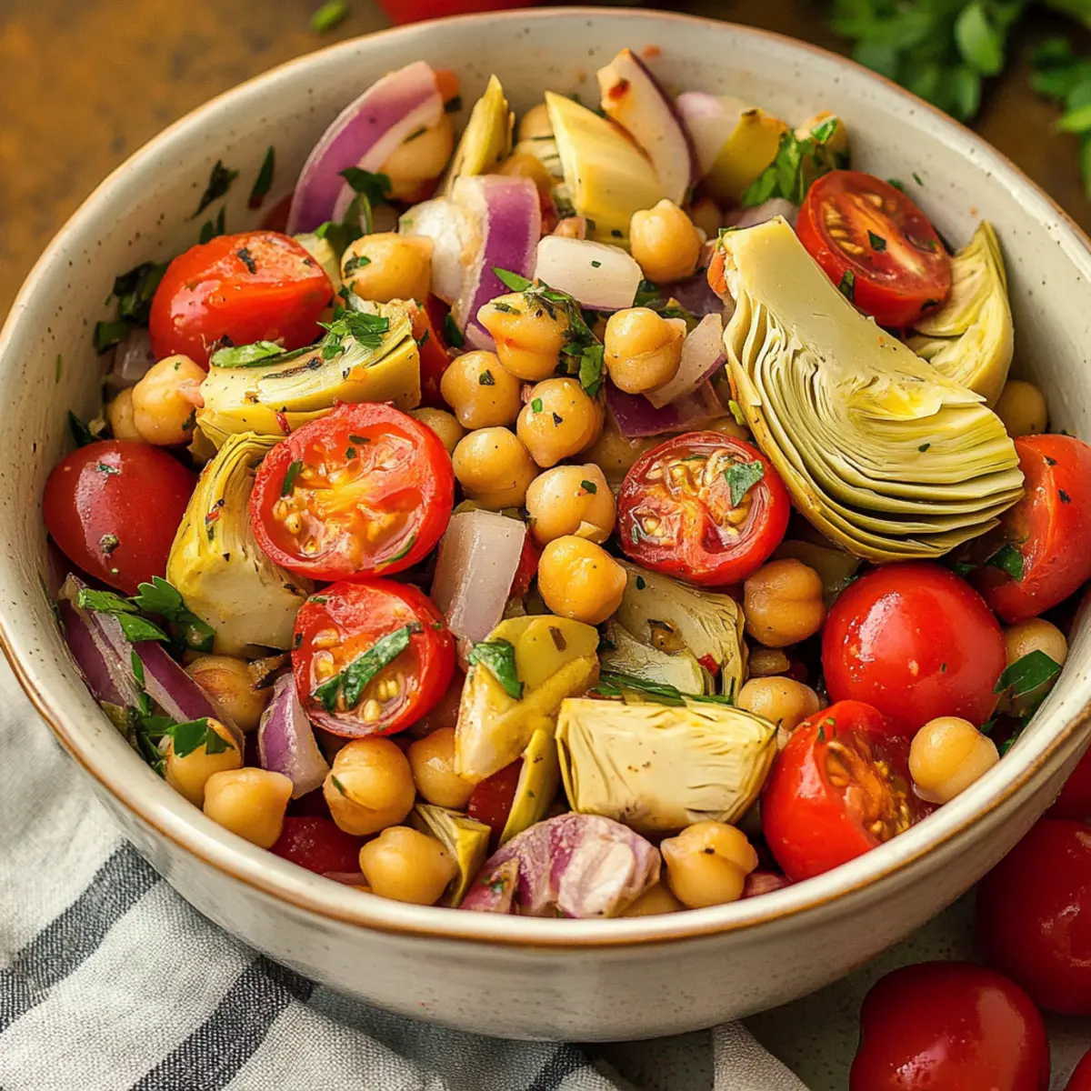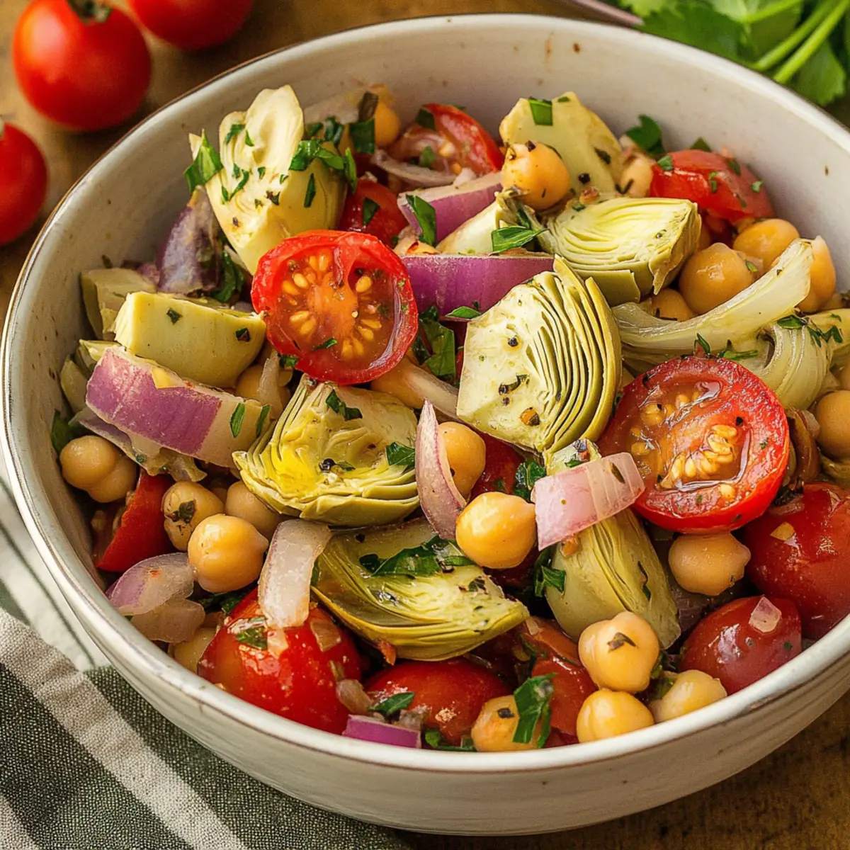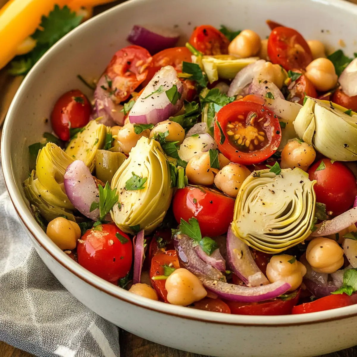 In a large bowl, combine the halved cherry tomatoes, sliced red onion, prepared chickpeas, and marinated artichoke hearts. Gently fold in a handful of capers for that briny kick. Drizzle the homemade vinaigrette over the top, then toss everything together until the salad is evenly coated and colorful—aim for a vibrant medley!